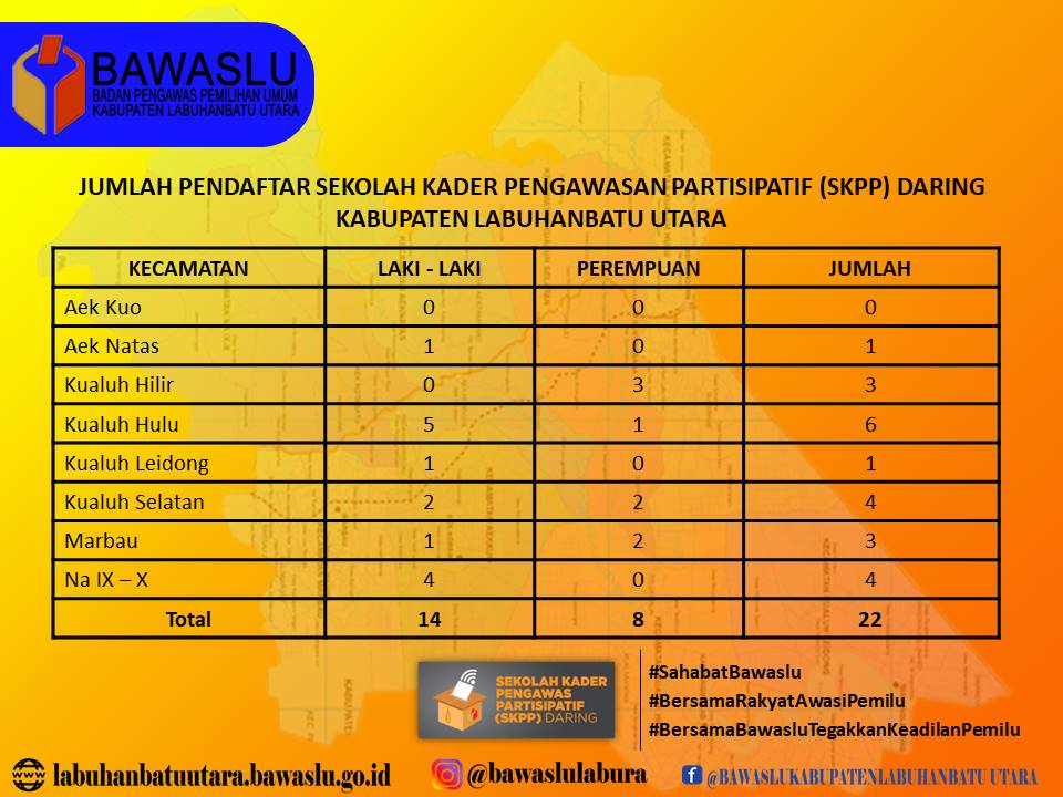 JUMLAH PENDAFTAR SEKOLAH KADER PENGAWASAN PARTISIPATIF ( SKPP ) DARING KABUPATEN LABUHANBATU UTARA humas | Senin, April 13, 2020 - 08:11 Tag Funny Information Share Berita Terkini humas Selasa, Januari 20, 2026 - 15:38 Bawaslu Labuhanbatu Utara Perkuat Kapasitas Penyelesaian Sengketa Pemilu dan Pilkada humas Selasa, Januari 20, 2026 - 15:30 Bawaslu Labura Laksanakan Penguatan Kapasitas Terkait Tata Kelola Keuangan humas Selasa, Desember 9, 2025 - 13:40 Bawaslu Labura Sampaikan Catatan Korektif pada Pleno PDPB Triwulan IV Tahun 2025 Lihat Lainnya