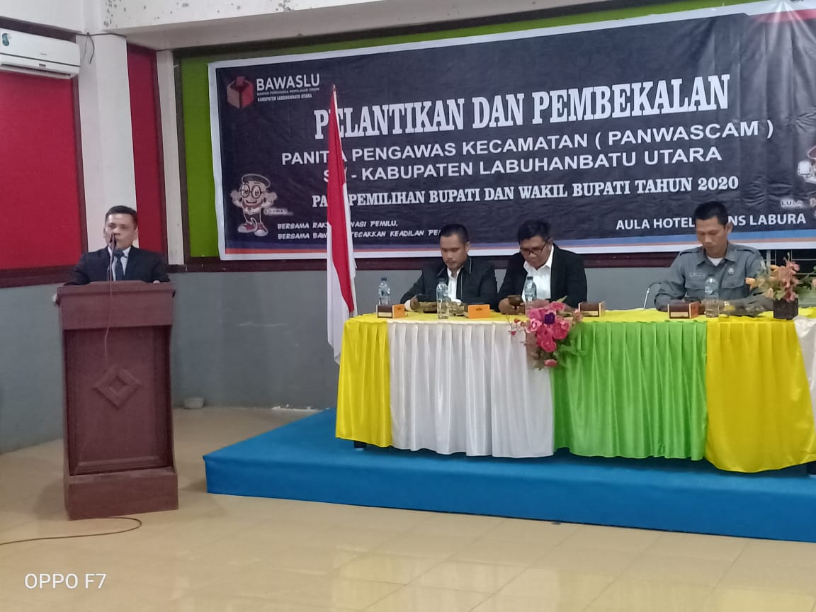 Senin, 23 Desember 2019, Bawaslu Kabupaten Labuhanbatu Utara melaksanakan kegiatan Pelantikan sekaligus Pembekalan bagi Panitia Pengawas Kecamatan se_Kabupaten Labuhanbatu Utara di Aula Hotel Grans Labura Kanopan.