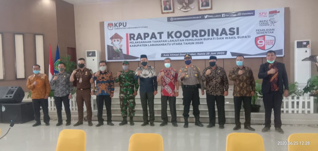 Kamis,25 juni 2020 KPU Kabupaten Labuhanbatu Utara mengadakan rapat koordinasi dengan instansi-instansi terkait antara lain Bupati, Bawaslu, TNI/Polri, Partai Politik dan SKPD-SKPD Kabupaten Labuhanbatu Utara. kegiatan tersebut dilaksanakan di Aula Dewi Syukur Kantor Bupati Kabupaten Labuhanbatu Utara dengan menjalan Protokol kesehatan Covid 19. kegiatan tersebut bertujuan untuk mensosialisasikan pelaksanaan tahapan lanjutan pemilihan Bupati dan Wakil Bupati Kabupaten Labuhanbatu Utara tahun 2020.