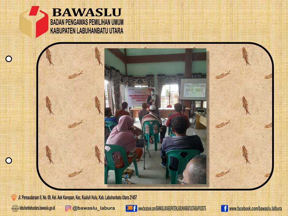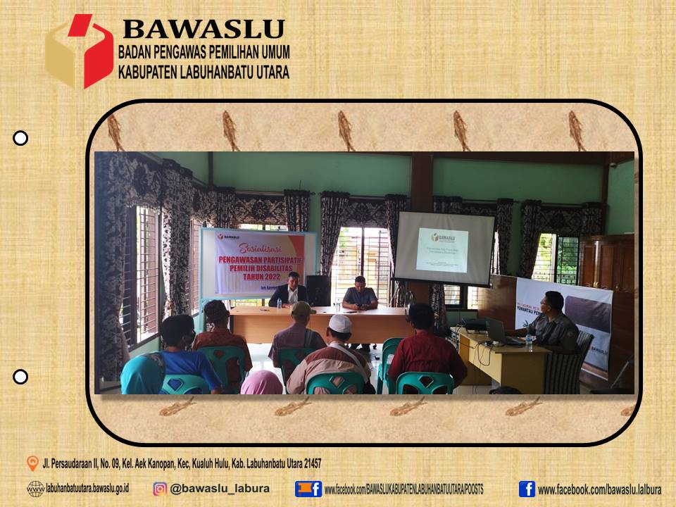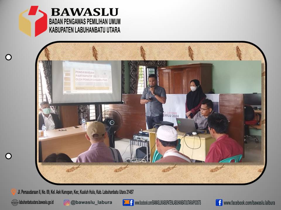 Bawaslu Kabupaten Labuhanbatu Utara melakukan kegiatan Sosialisasi di Kantor Kesekretariatan Bawaslu Kabupaten Labuhanbatu Utara. Kegiatan tersebut mengusung tema" Sosialisasi Pengawasan Partisipatif oleh Pemilih Disabilitas".