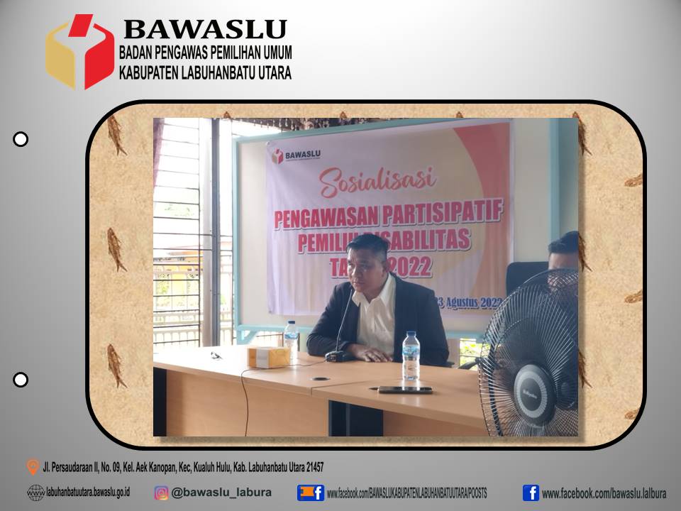 Maruli Sitoru ( Koordinator Divisi Pencegahan, Pengawasan dan Hukum ) Bawaslu Kabupaten Labuhanbatu Utara yang menjadi penanggungjawab serta Narasumber kegiatan Sosialisasi ini menyampaikan kepada Peserta Sosialisasi bahwa Penyandang Disabilitas sangat diperhatikan oleh Negara dengan terbitnya Undang - Undang Nomor 8 Tahun 2016 tentang Penyandang Disabilitas.